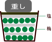 2.つぼに「梅」「塩」の順に交互にいれる。塩は、全量の2/3を使い、残りの1/3は、置き塩として残す。